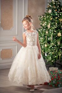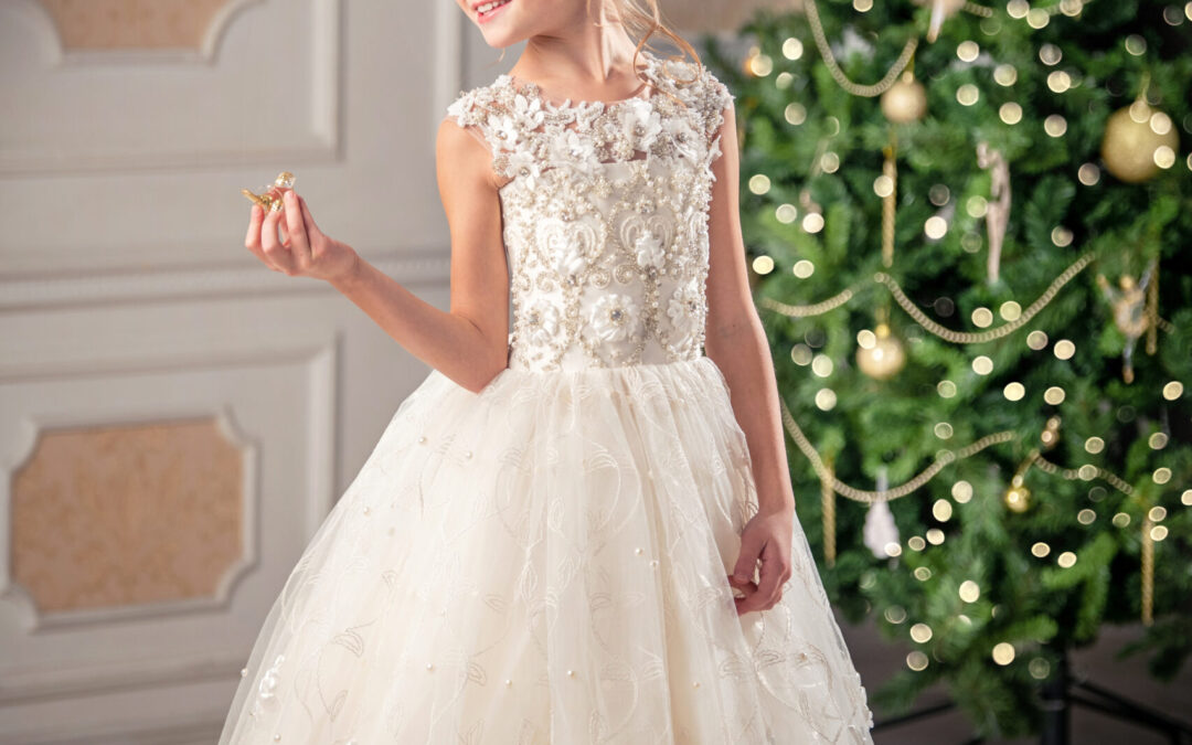 portrait of a girl in a beautiful dress on a background of the Christmas tree